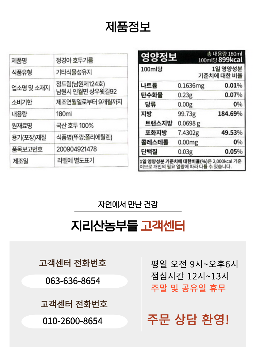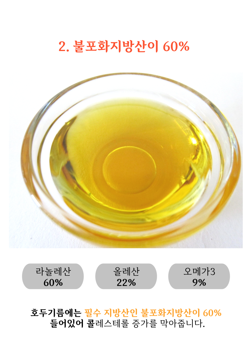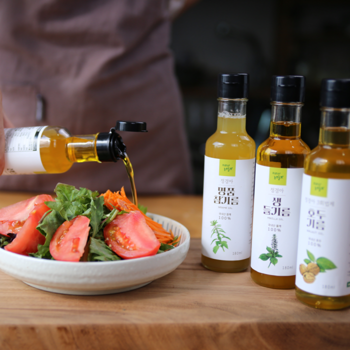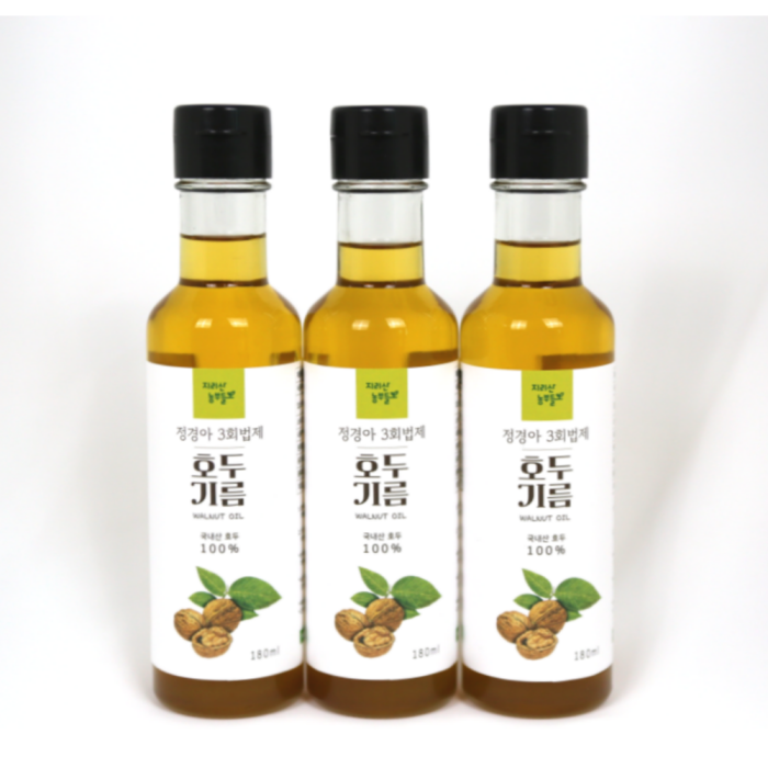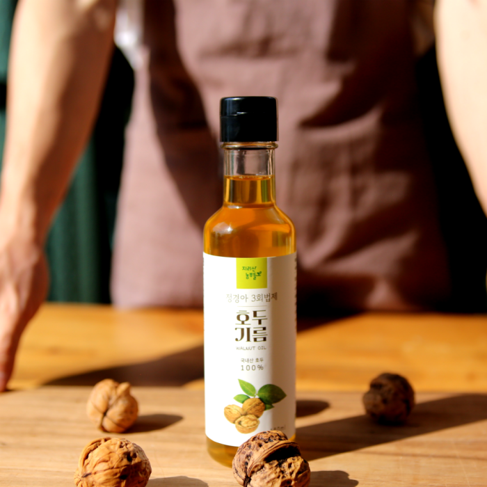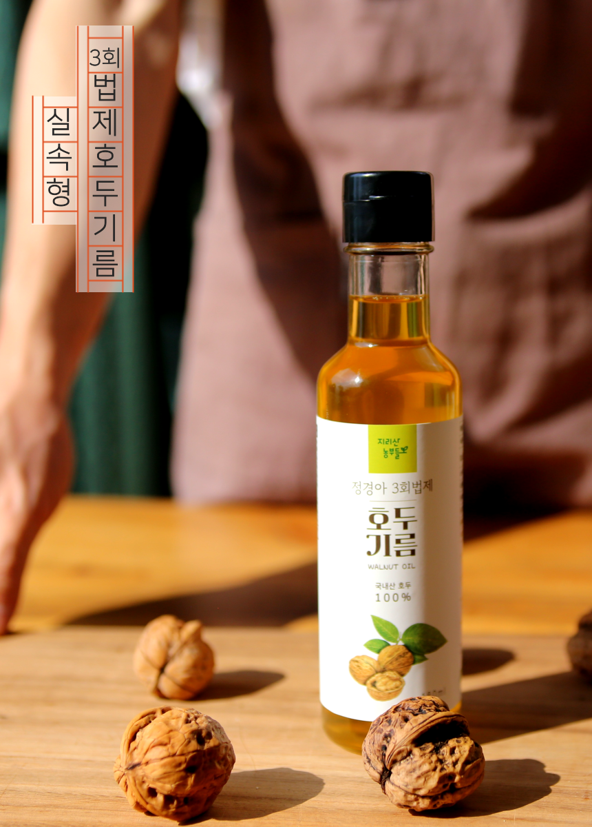 Jeong Kyeong-ah's 3-time recipe walnut oil is an oil obtained by steaming high-quality walnuts three times, concentrating them, and then pressing them. Through the traditional three-time method, we preserve the nutrients of walnuts as much as possible, remove their toxicity, and provide walnut oil with excellent taste and aroma. This product can be expected to have a variety of health benefits, including brain health, heart health, and skin improvement.