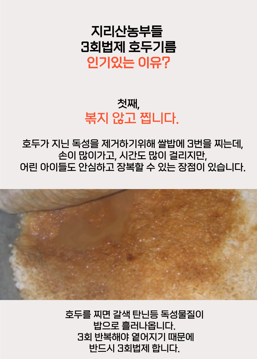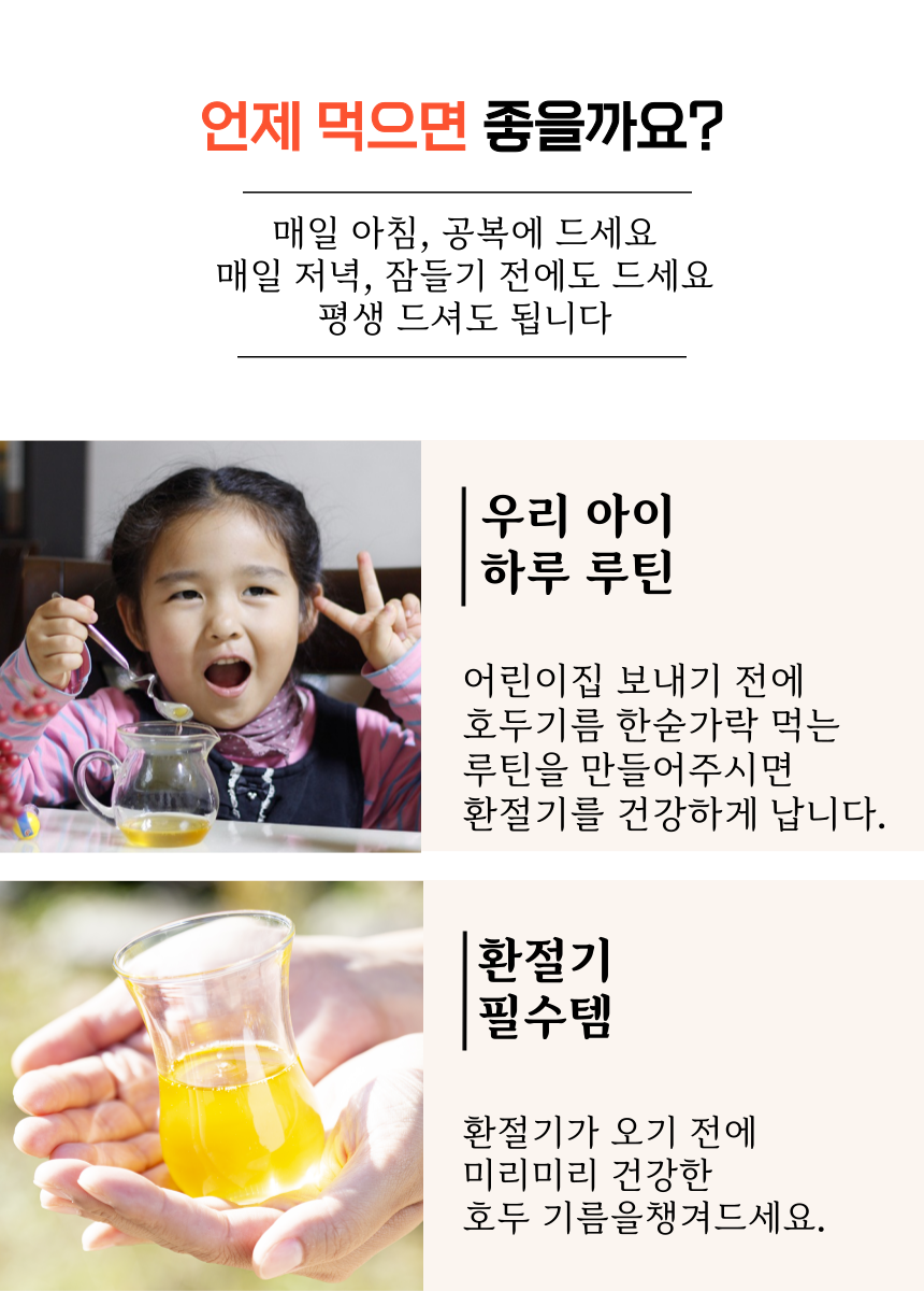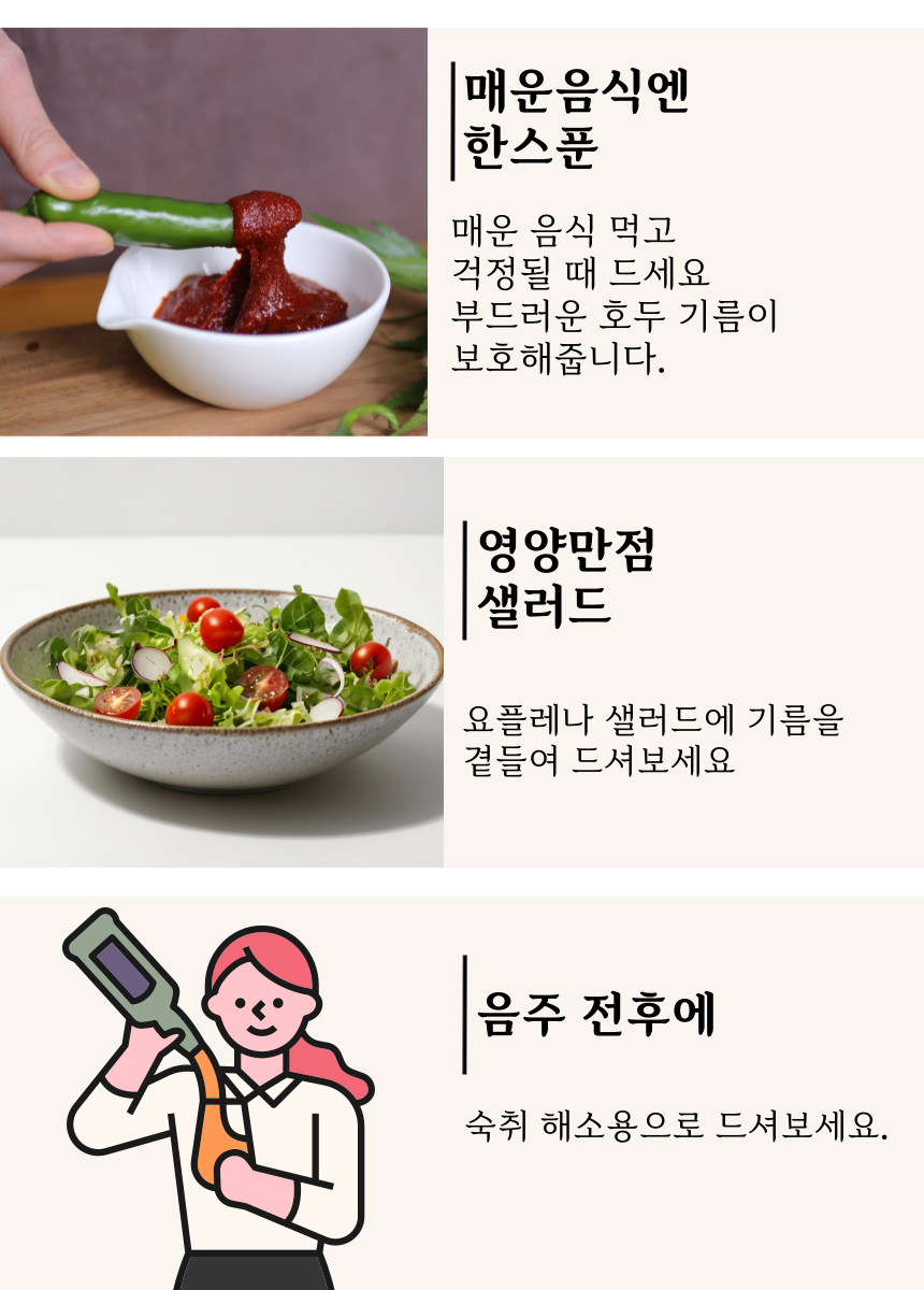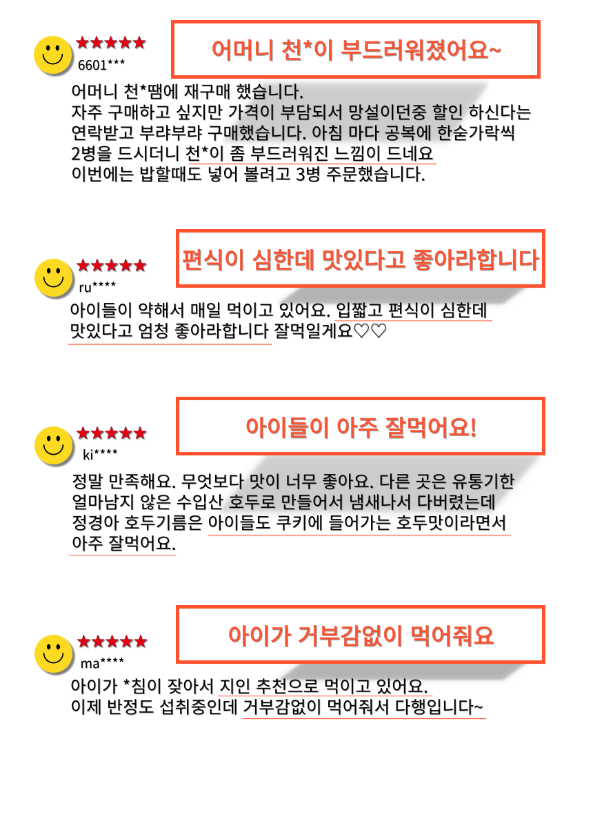 Jeong Kyeong-ah's 3-time recipe walnut oil is an oil obtained by steaming high-quality walnuts three times, concentrating them, and then pressing them. Through the traditional three-time method, we preserve the nutrients of walnuts as much as possible, remove their toxicity, and provide walnut oil with excellent taste and aroma. This product can be expected to have a variety of health benefits, including brain health, heart health, and skin improvement.