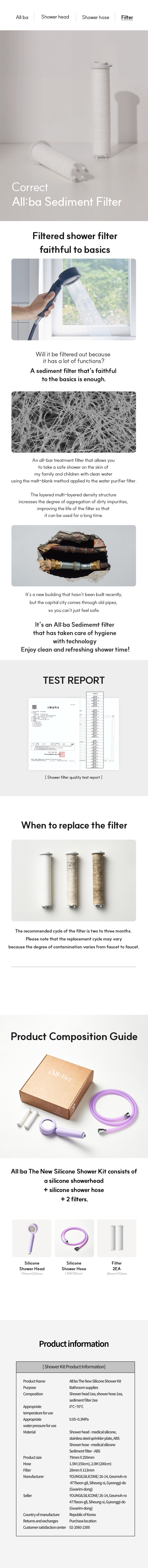 Installation is quick and tool-free. The hose and head are compatible with most standard shower fittings, so you can simply connect, tighten by hand and start using immediately. The durable medical-grade silicone material has excellent resistance to heat, moisture and discoloration, allowing the kit to maintain its look and performance over long-term use. With a replaceable sediment filter and a hygienic silicone body, All:ba The New Silicone Shower Kit is an ideal choice for households seeking a safer and more dependable shower system.