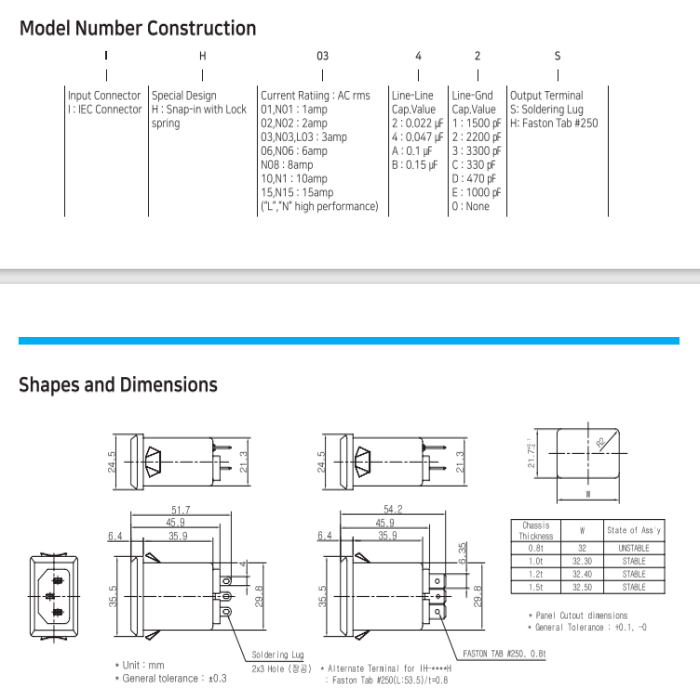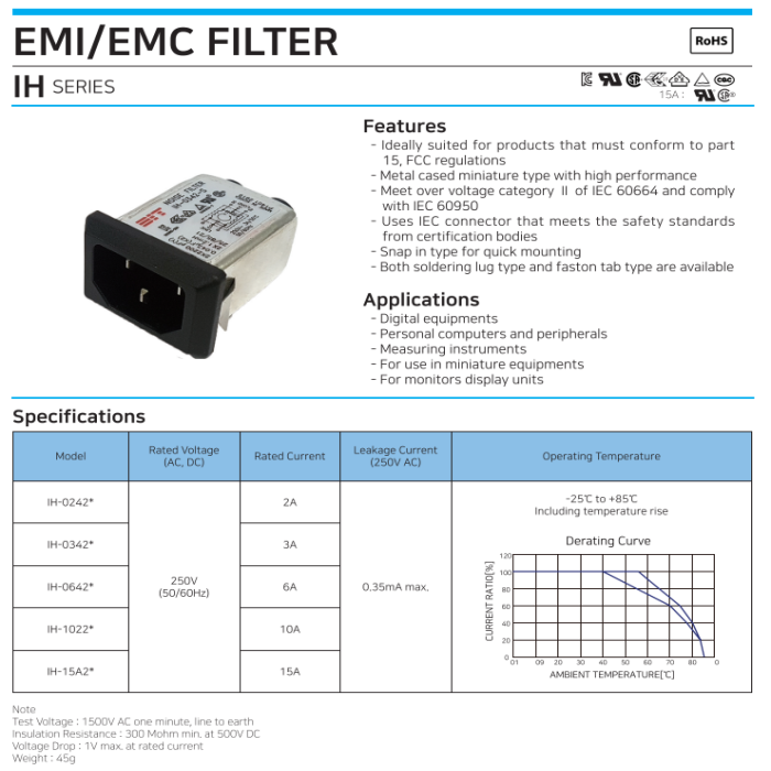 [IH-0242S] EMC/EMI Filter, Inlet, 2A, Snap-in with Lock Spring, Soldering Lug