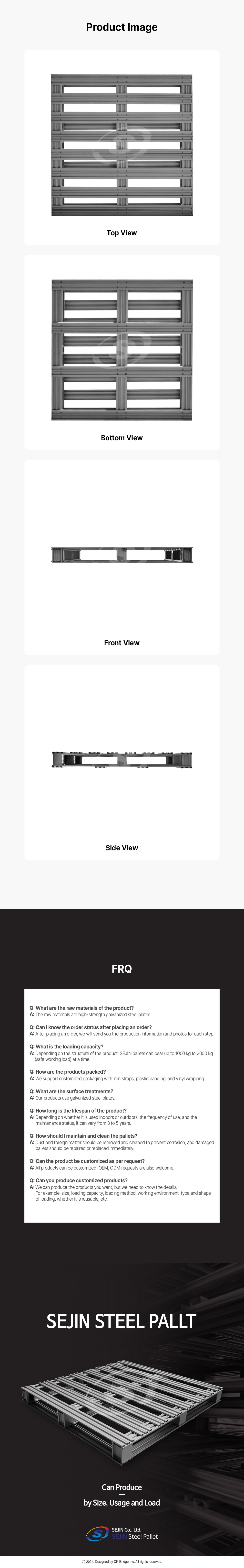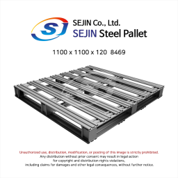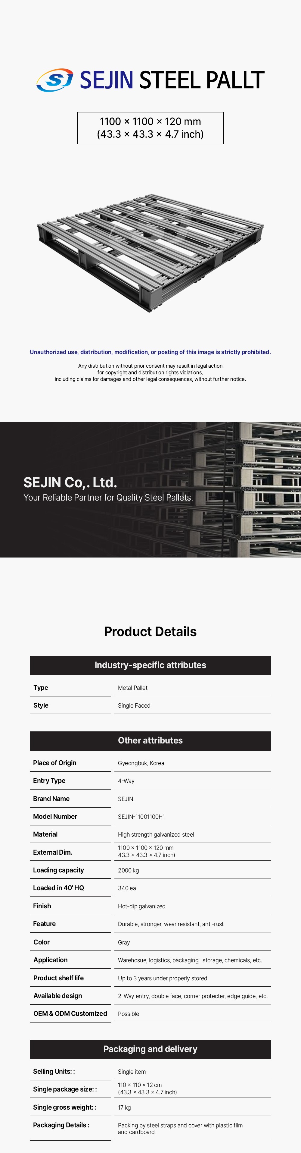It is a single sided 4-way galvanized steel pallet in 1100*1100*120 size.
