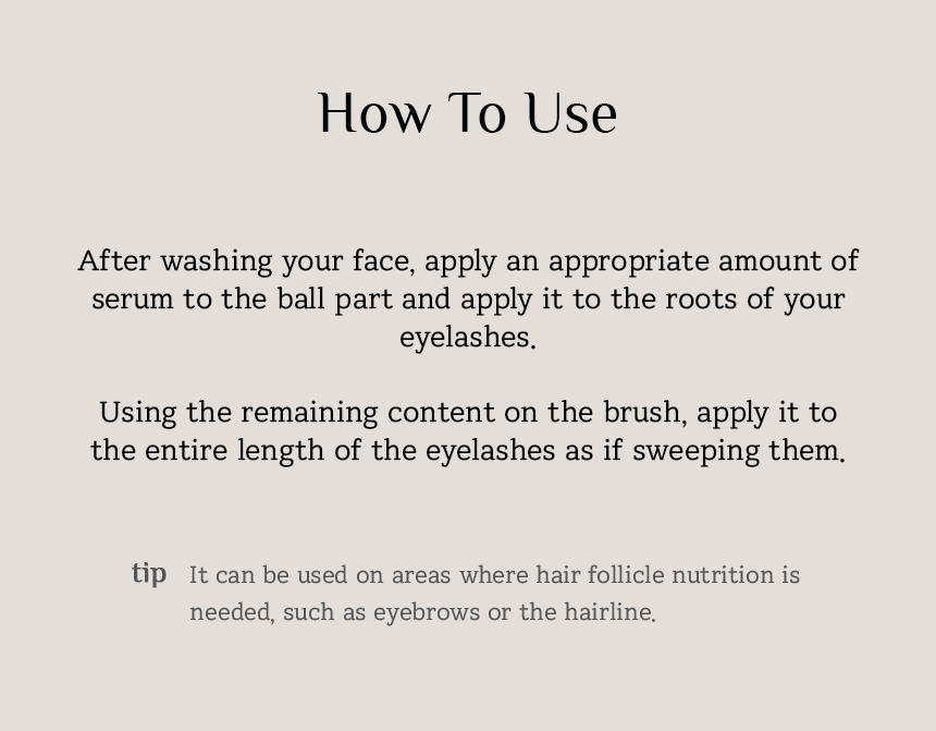 A serum tailored to the eyelash growth cycle, strengthening the roots of the eyelashes, preventing hair loss, and promoting the growth of new eyelashes.