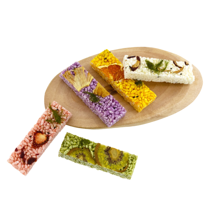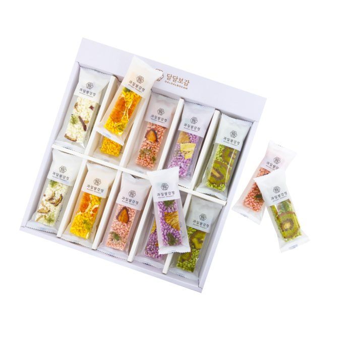 - It created natural colors with non-fried domestic white rice and natural powder, and sweetened with lactobacillus-rich fructooligosaccharide. With its own dry fresh fruit chips, the fragrant taste and aroma of the fruit are excellent.