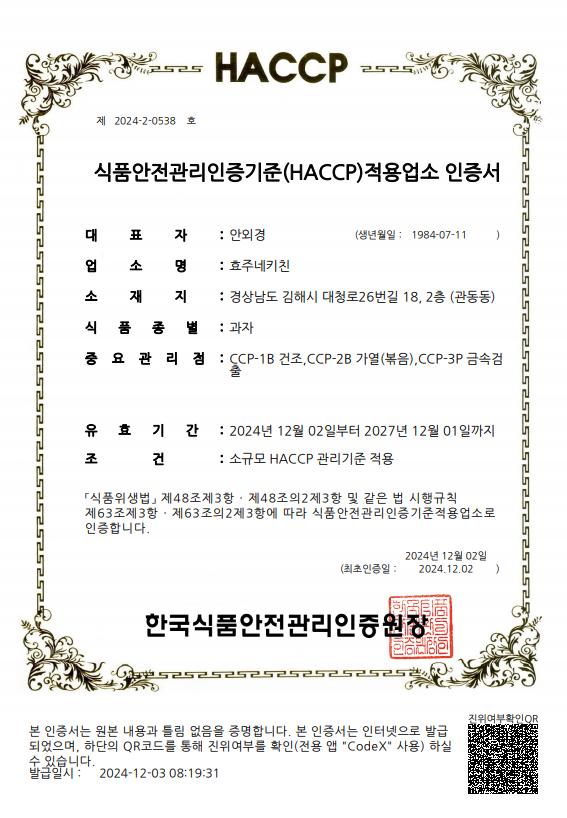 HACCP (Hazard Analysis and Critical Control Point) is an organization that operates a system that sets and manages risk analysis and critical control points to ensure the safety of food, and Hyojukitchen is certified by HACCP.