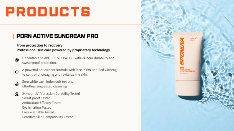 The SPONUVA PDRN Active Suncream Pro is a high-performance sun care solution designed for professional athletes and all users who engage in frequent outdoor activities and challenge their limits daily.