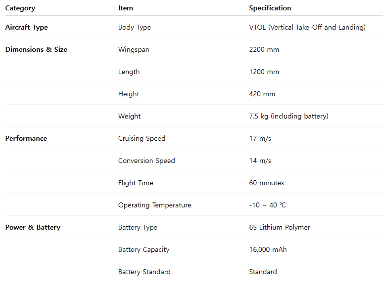 This high-performance VTOL drone is engineered entirely with domestically developed technology and constructed using durable Expanded Polypropylene (EPP) material, ensuring an ideal balance between strength, lightness, and ease of maintenance.