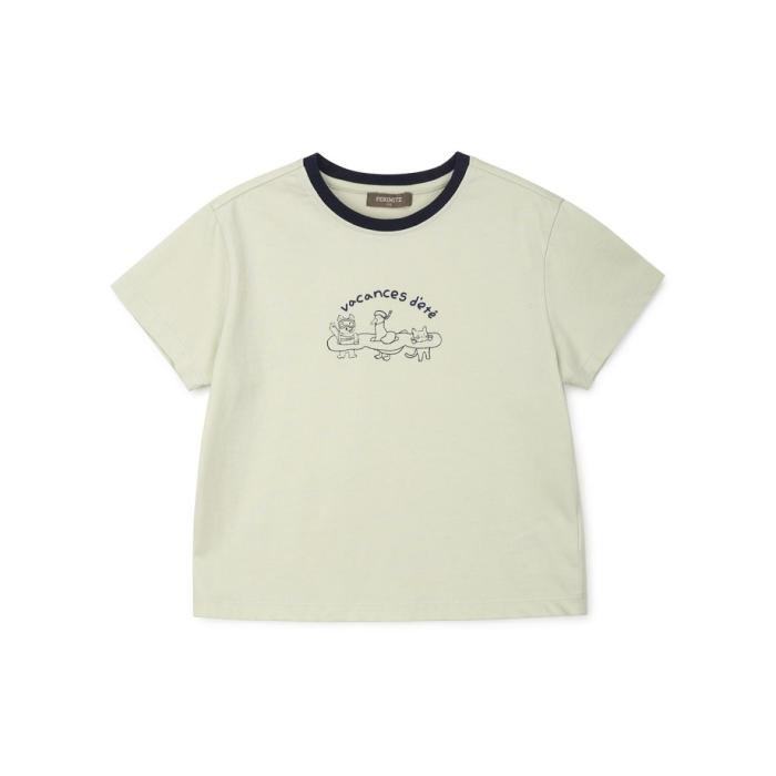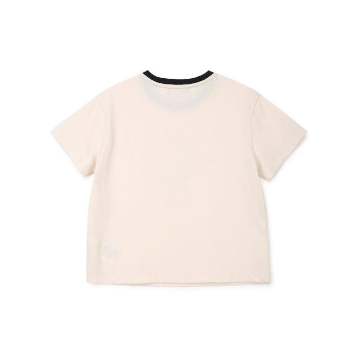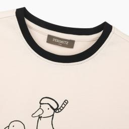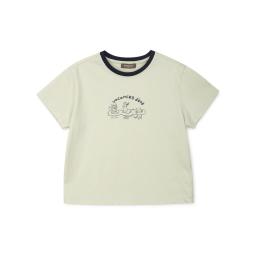 A playful character-print T-shirt with a contrasting neck color, made from lightweight CP fabric that feels cool and doesn’t cling to the skin.