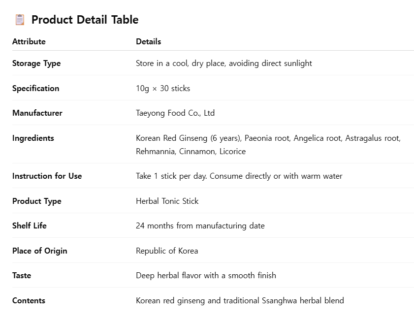 This is a health stick that harmoniously combines 6-year-old red ginseng, a specialty of Korea, with carefully selected traditional plant-based ingredients such as cnidium officinalis, peony root, and lingzhi.