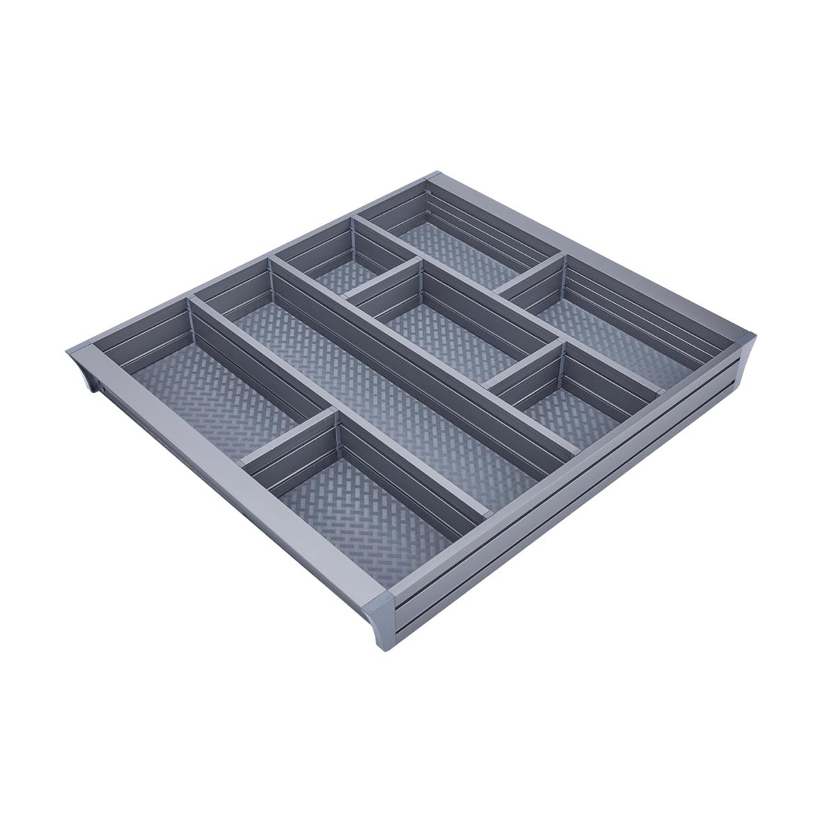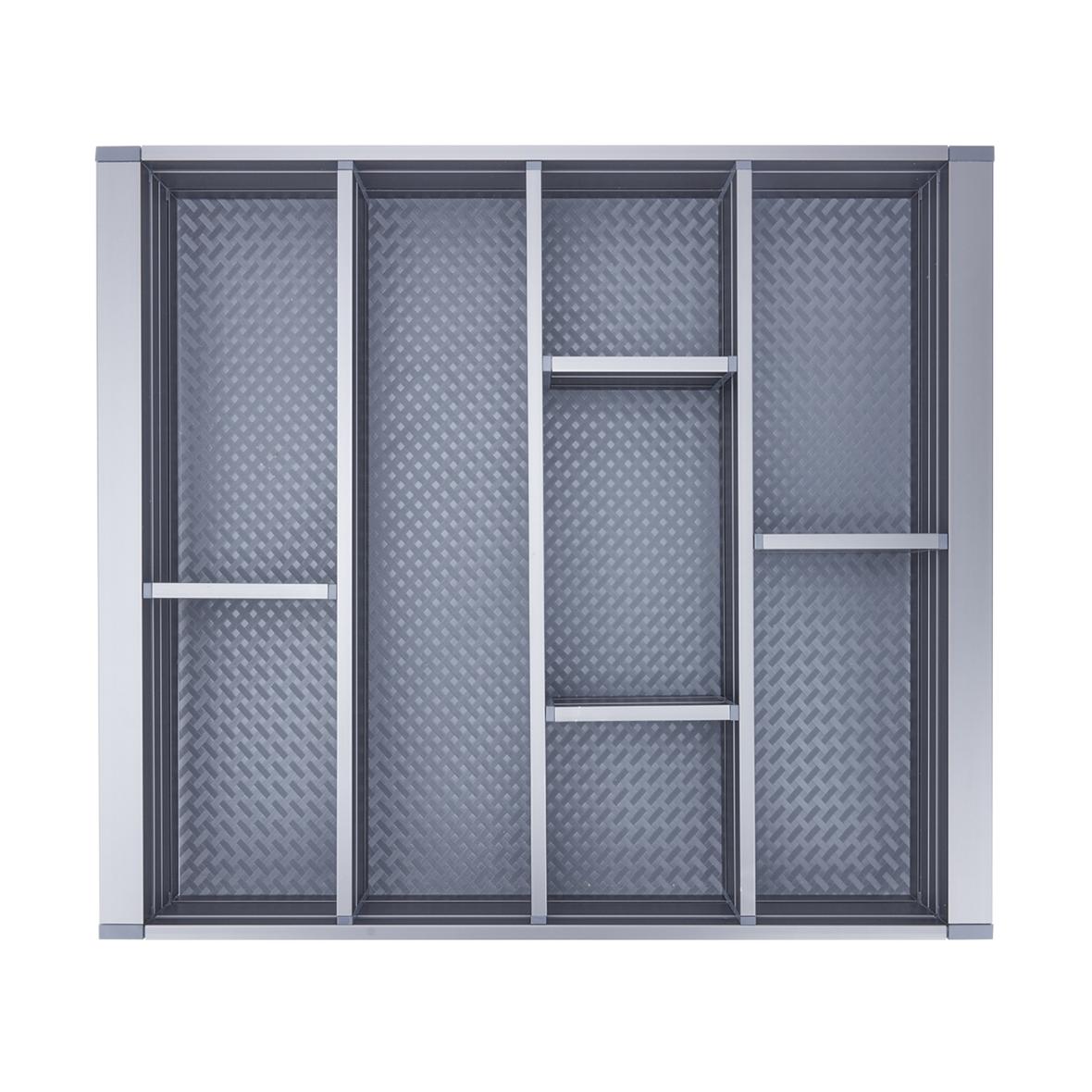 This divider is designed to efficiently organize utensils inside a drawer. It allows for customizable size adjustments based on the drawer specifications, offering a flexible storage solution.