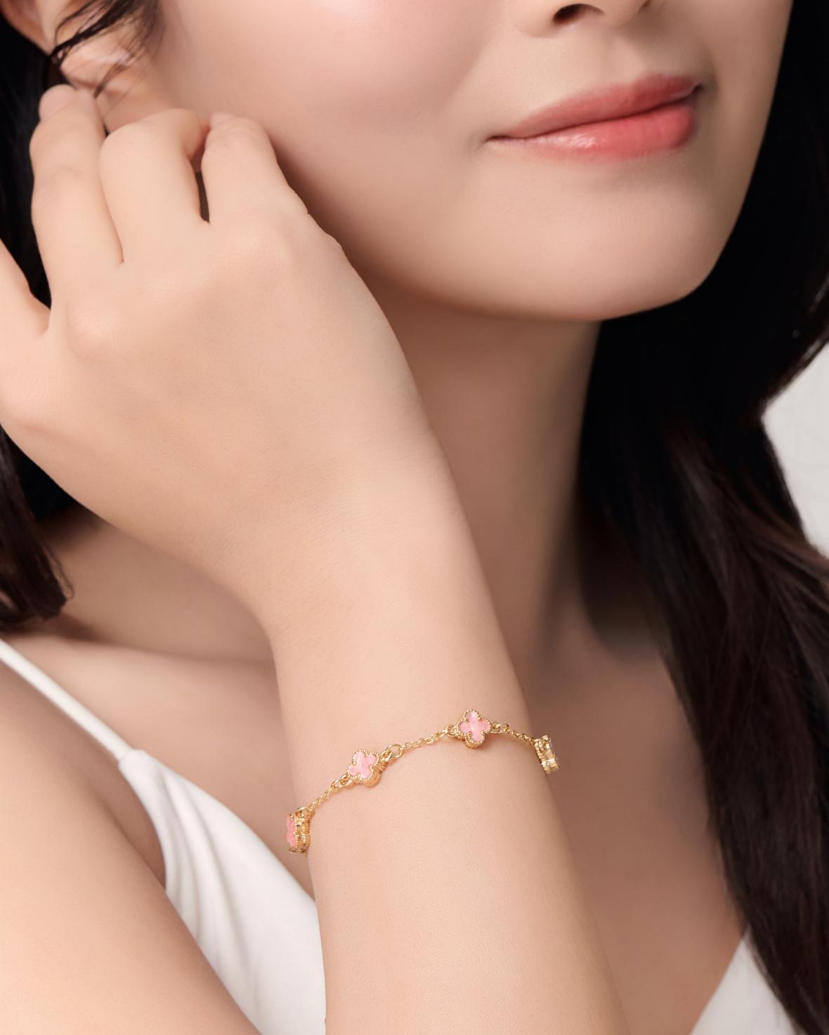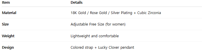 Crafted with meticulous detail in Korea, this bracelet features a colorful front strap and a sparkling cubic zirconia on the back side of the clover — offering beauty from every angle.