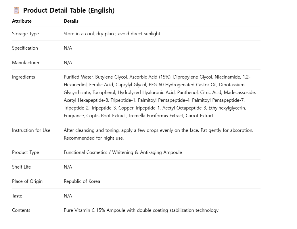 Recommended skin* Skin in need of help to improve whitening* Skin that is lifeless or needs improvement in blemishes (fogging, pigmentation, freckles, etc.)* dull skin* dark skin* skin that is dull or rough and lifeless 1. Contains 15% ascorbic acid2. It contains 15% pure vitamin C, which has strong antioxidant effects and excellent effects such as prevention of skin aging, pigmentation relief, and elasticity3. Antioxidant effect removes free oxygen and prevents aging4. Pure vitamin C promotes collagen synthesis to maintain elasticity and improve wrinkles5. The effect of reducing pigmentation improves blemishes and blemishes and bright skin tone6. Ampoule that stabilizes light, heat, and oxidation by making pure vitamin (ascobic acid) safer than regular vitamin C by applying the double coating method developed independently by its company7. Containing niacinamide and ferulic acid, whitening and antioxidant effects All ingredientspurified water, butylene glycol, ascorbic acid, dipropylene glycol, niacinamide, 1,2-hexanediol, ferulic acid, caprylglycoliase-60 hydrogenated castor oil, dipotaxiumglycirizate, tocopherol, hydrolized hyaluronic acid, panthenol, citric acid, madecasoside, acetylhexapeptide-8, tripeptide-1, palmitoylpentapeptide-4, palmitoylpentapeptide-7, tripeptide-2, tripeptide-3, capertapeptide-1, acetyloxypeptide-3, etchylhexylglycerin, flavoring, coptis root extract, tremella fuciformis extract, carrot extract