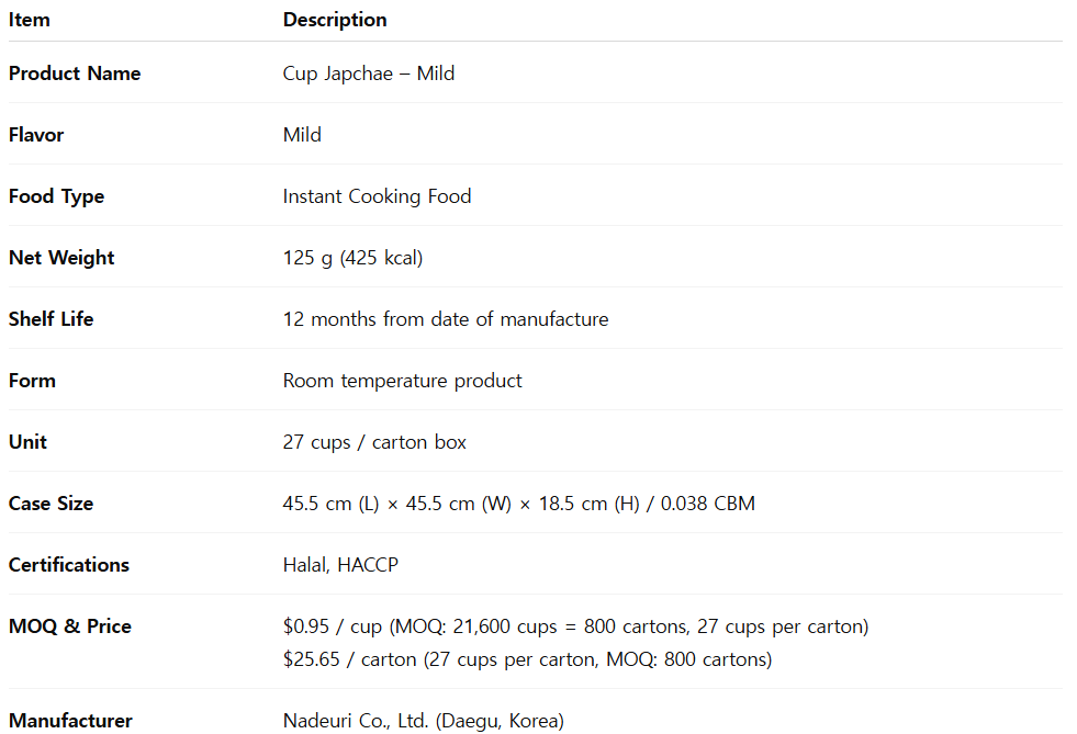 Cup Japchae (Mild) is a Halal- and HACCP-certified Korean instant noodle cup inspired by one of Korea’s most beloved traditional dishes, Japchae.