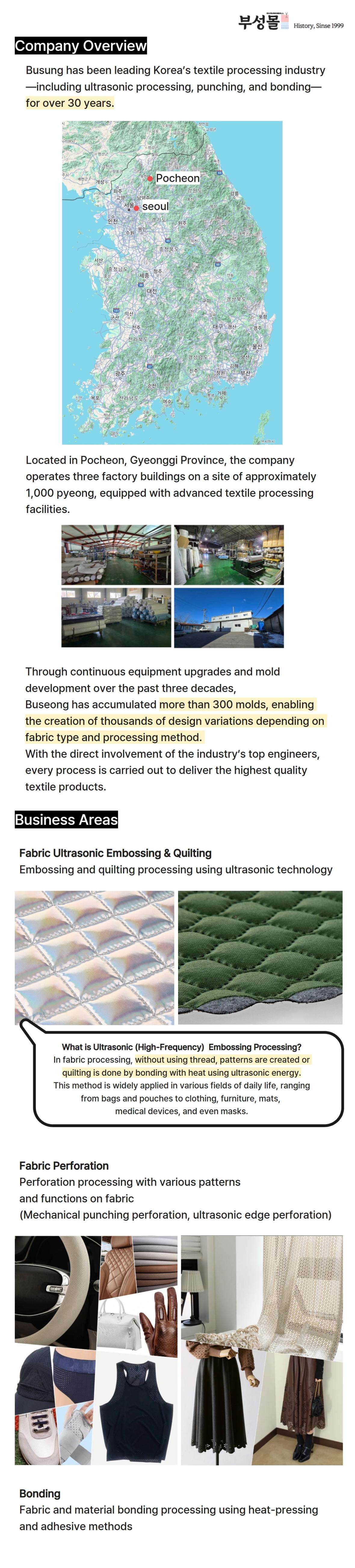 Buseong has been leading Korea’s textile processing industry—including ultrasonic processing, punching, and bonding—for over 30 years.