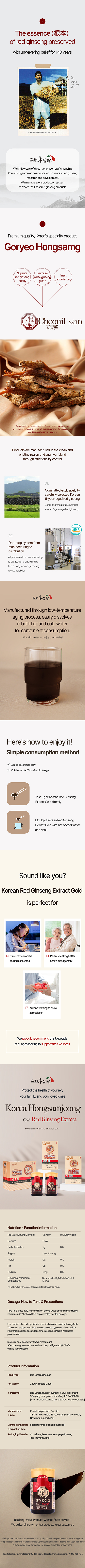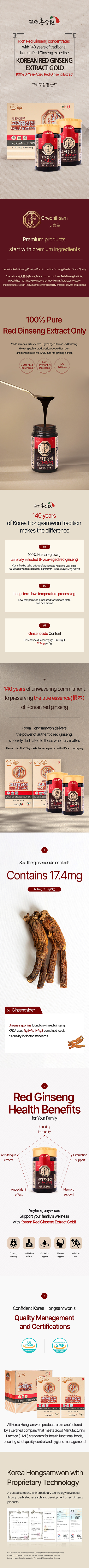 Korean Red Ginseng Extract GOLD 480g represents the pinnacle of Korea Hongsamwon's 140-year heritage in ginseng cultivation and processing. This premium concentrate is crafted exclusively from carefully selected, 6-year-aged Korean red ginseng using a proprietary low-temperature aging process that preserves maximum bioactive compounds.