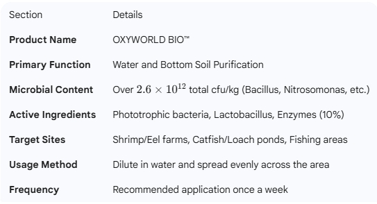 | Product Description | OXYWORLD BIO™ is a cutting-edge, eco-friendly water purifier designed to revitalize aquatic environments. By leveraging a high-concentration microbial complex, it doesn't just treat the water surface—it actively purifies the bottom soil and enhances overall ecosystem health, ensuring a thriving habitat for various aquatic species. |