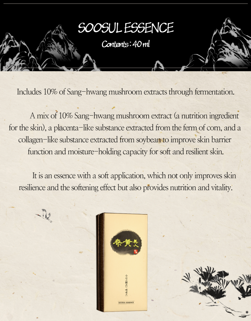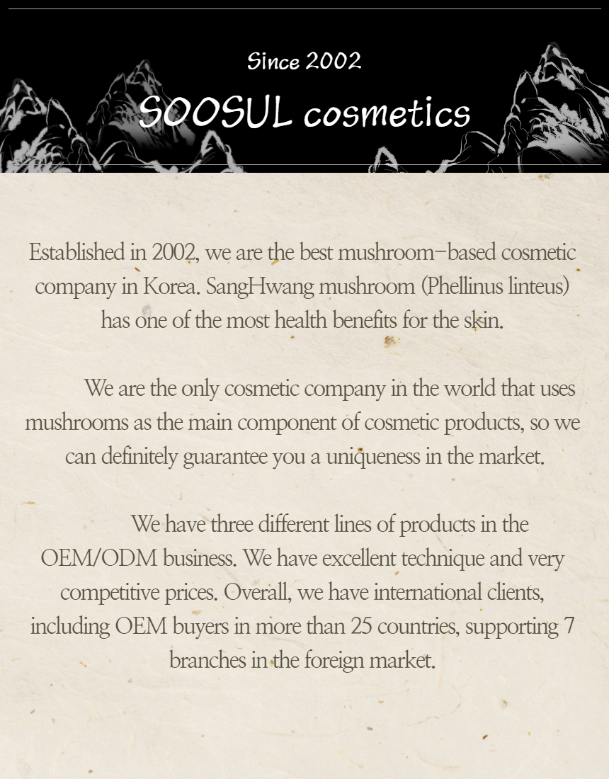 Established in 2002, SOOSUL Cosmetics Co., Ltd. has been researching for 18 years the unique Sang-Hwang mushroom components and its extracts, and following this the company has acquired a variety of patents on anti-acne, anti-aging and whitening effects of the extracts of Sang-Hwang mushroom, which is cultivated and organically grown in Korea.