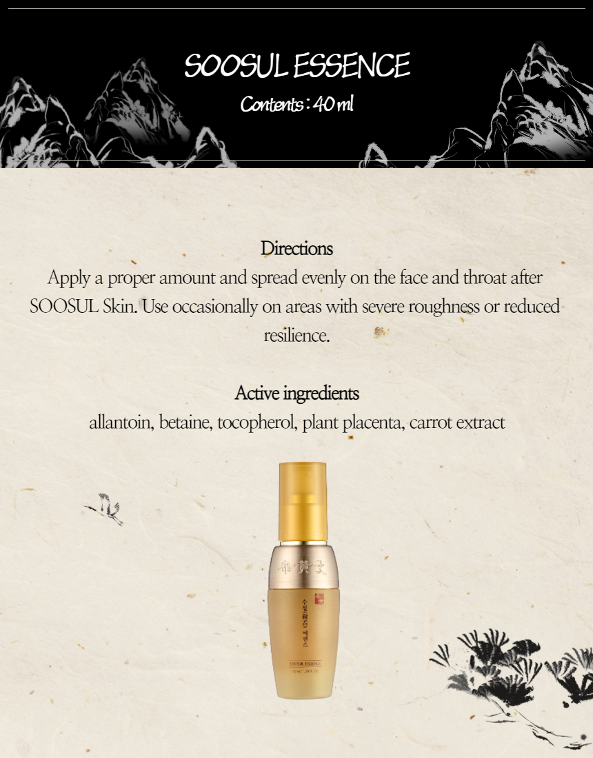 - Directions : Apply a proper amount and spread evenly on the face and throat after SOOSUL skin. Use occasionally on the areas with severe roughness or reduced resilience.