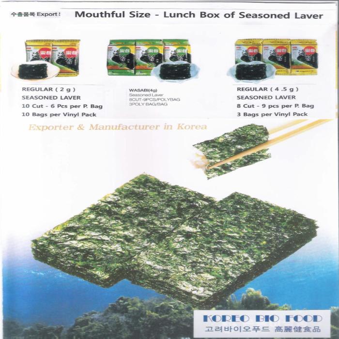Seasoned Laver < usually called a herb of eternal youth in the sea > is taken with rice and is consumed as a snack food. Roasted laver is used for Sushi Nori ( this is famous as Japanese food ) and Rice Rolled in Laver.