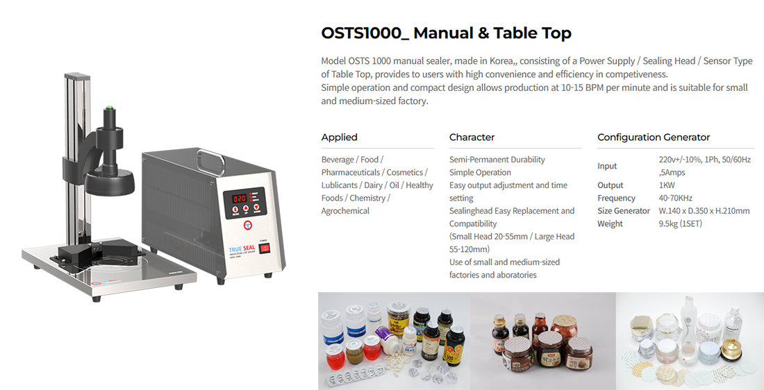 Model OSTS 1000 manual sealer, made in Korea, consisting of a generator (main body), sealing head, and table‑top type sensor, provides users with high convenience and efficiency for competitiveness.